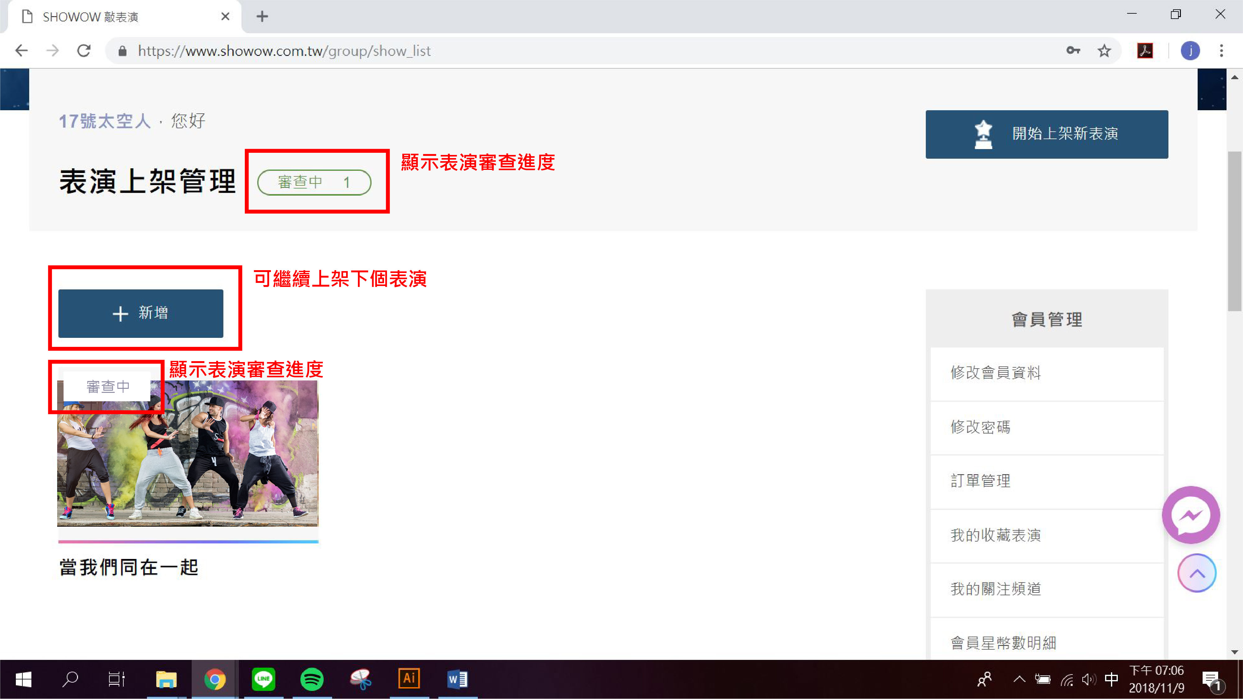 在「會員中心」裡,可以查看您表演的審查進度,或對已上架的表演進行內容更新、修改